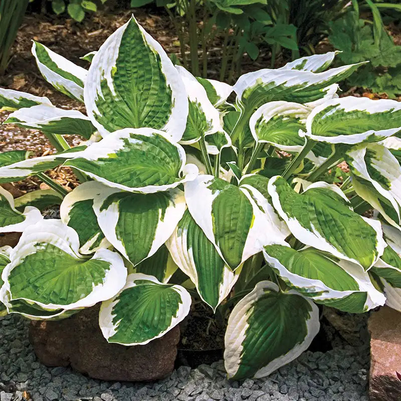 Its striking dark green leaves have extra-wide margins that start out creamy yellow before maturing to bright white. The slightly wavy foliage is slug resistant and handles sunlight well. Lavender blooms open on 30" scapes. Winner of the Award of Garden Merit and a former Hosta of the Year!
