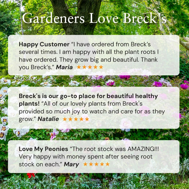 Over 200 Years of Customer Satisfaction. If, for any reason, you're not completely satisfied with any bulb, bareroot perennial or potted plant upon receipt, after planting or once it grows and blooms, just contact Breck's anytime—no time limit—for as long as you garden.