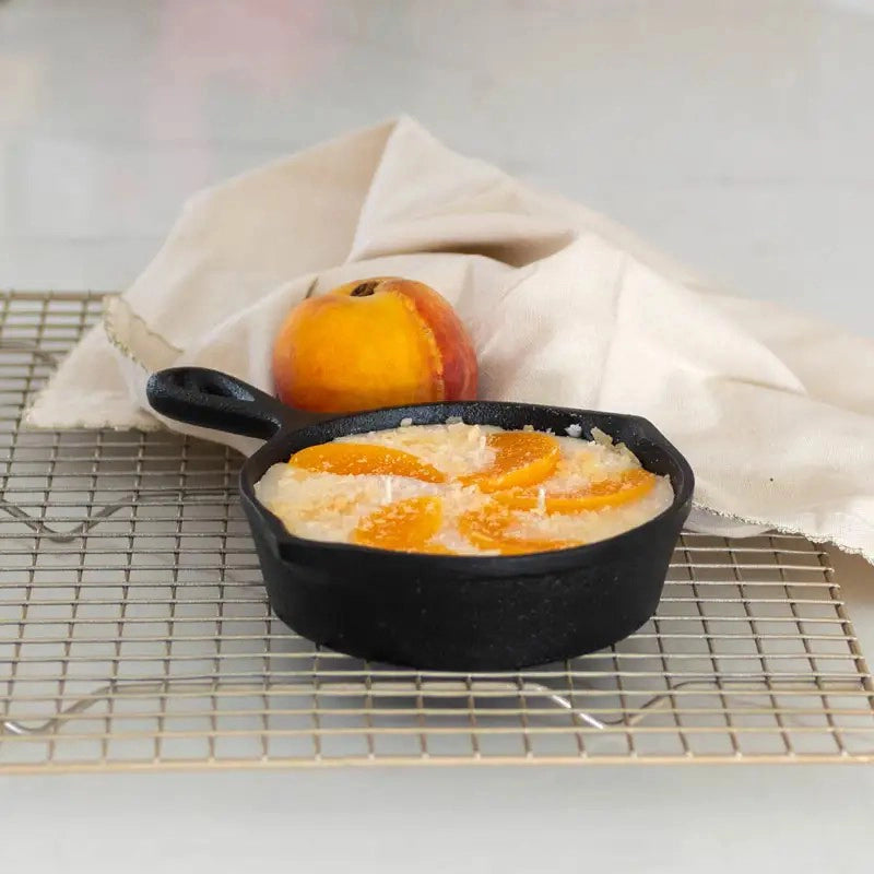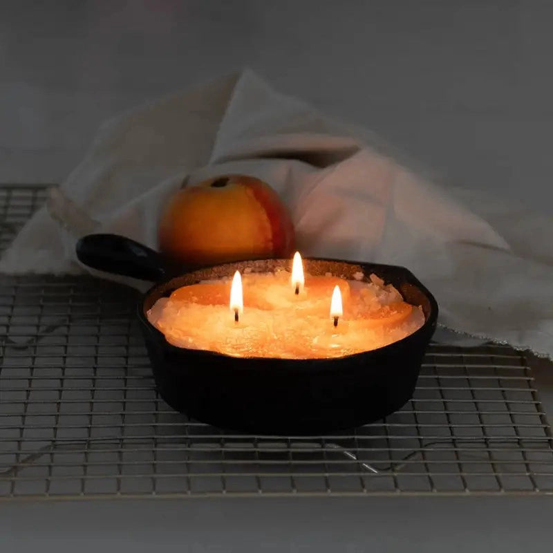 With a scent that evokes summer (with a little spice, for good measure), this lusciously fragrant decorative candle makes the perfect gift for a special friend, relative or loved one. Expertly hand poured into a miniature cast iron skillet, this 3-wick candle fills every room with the homemade aroma of peaches, nutmeg, cinnamon and brown sugar. Hints of vanilla add to the warming scent. Made in Beaver Dam, Wisconsin by artisan candle makers, it's sure to delight any recipient. (8 oz. Candle, Pan: 8"l, 5¾"w, 1½"h)