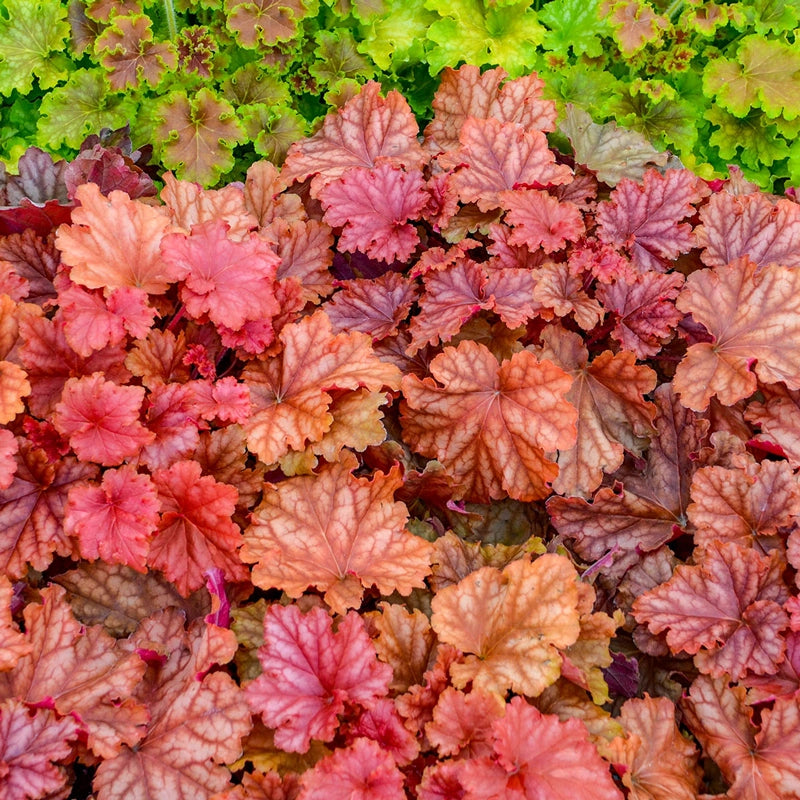 Bright, heavily ruffled apricot-orange leaves with a silvery overlay and vivid pink undersides form a dense, low mound. Peachberry Ice is especially striking in spring and remains attractive through summer all the way until winter. Airy, creamy white bell flowers rise on burgundy stems to 24–30" and draw pollinators. Ideal for edging, containers and partial shade, this easy, adaptable perennial also makes a showy ground cover.