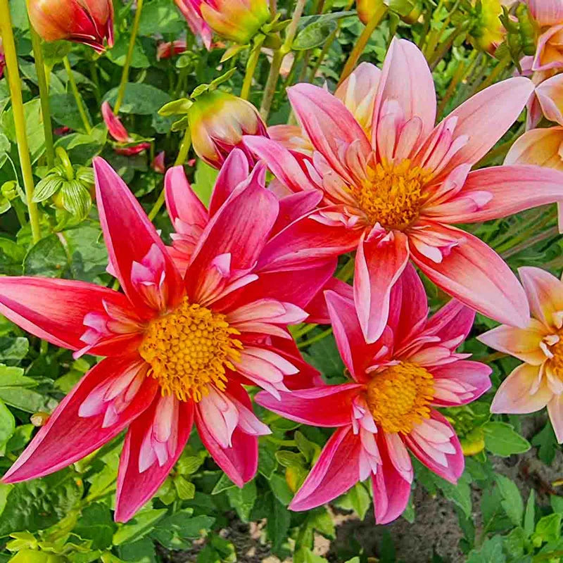 Ideal for front borders, patio containers or freshly cut bouquets, this compact collarette dahlia adds soft colour and texture wherever it's used. Each 2" bloom features pale pink outer petals brushed with deeper tones, a creamy yellow to white collar and a cheerful yellow centre. Its distinctive shape and pastel colouring lend a graceful note to the season’s end. Irresistible to visitors, passersby and pollinators.