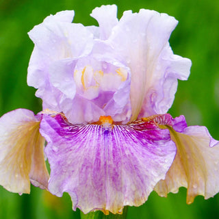 Ruffled, pale lavender standards display magenta highlights. The darker lavender falls are marked with fuchsia-red hafts. Hints of gold are visible beneath the lower petals.