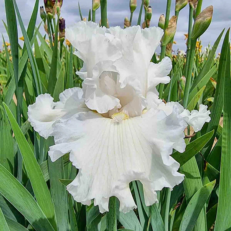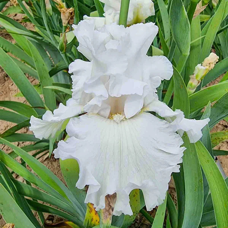 The extraordinary 4½" blooms pair snowy white standards with falls brushed in pale lavender-blue, creating a subtle two-tone effect. The ruffling is among the best we’ve seen in a white iris.