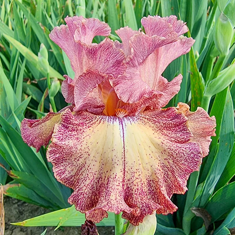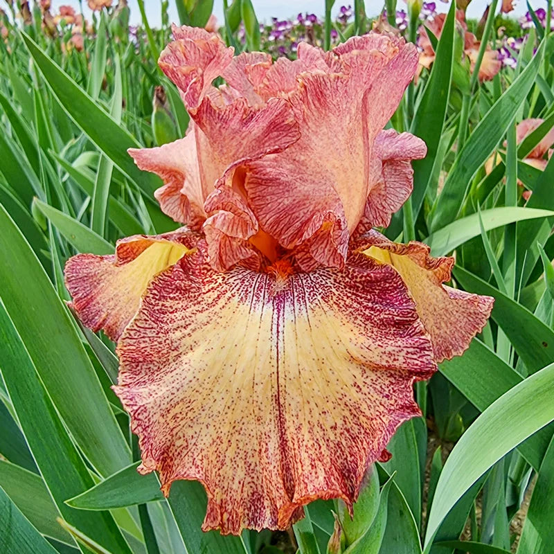Heavily ruffled and richly coloured, this striking plicata iris blends warm terracotta, brick red and dusky rose with a flash of white beneath a burnt orange beard. It’s unforgettable in bloom.