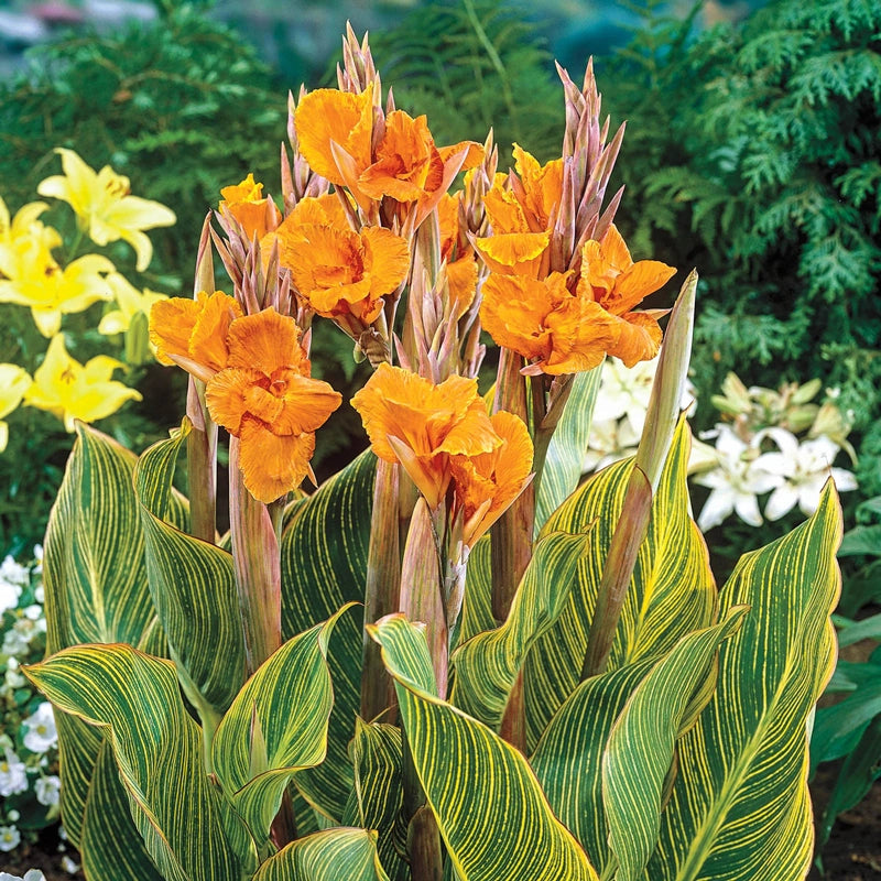 Pretoria boasts huge melon-orange blooms on strong stems that rise up from zebrastriped foliage. These large leaves create a magnificent display, even by themselves, with an eye-catching pattern of green and cream-yellow bands. Blooms appear in midsummer up to the first frost.