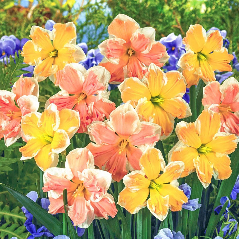 Immerse yourself in a garden of endlessly shifting colours with this remarkable daffodil and let its mesmerizing colour transition completely bewitch you. Beginning as a vibrant yellow, each lobed crown evolves into a stunning pink orange, offering the visual delight of two daffodil varieties in one. These 4" wide, fragrant wonders are framed by white to pale cream petals, ruffled for added elegance. Perfect for many uses in a variety of garden settings, the colourfast blooms also maintain their fresh look in a vase.