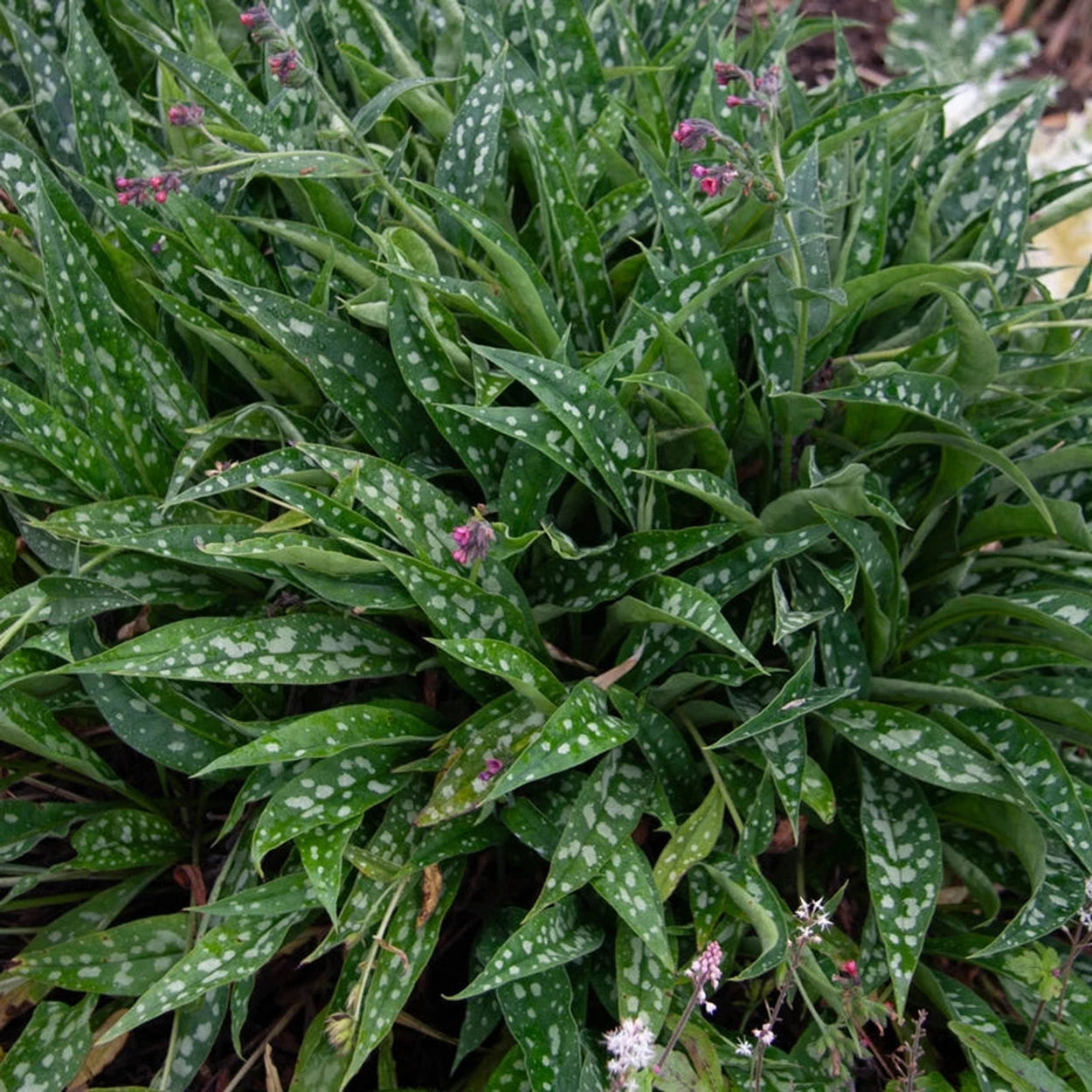 A: Plant Raspberry Splash Lungwort in partial to full shade with well-drained, humus-rich soil. Keep soil consistently moist, mulch to retain moisture, and remove old or damaged leaves to maintain a tidy appearance. Once established, lungworts need watered only in times of drought, and they require light fertilizer just once a year. Divide clumps every 3–4 years to encourage healthy growth and flowering.