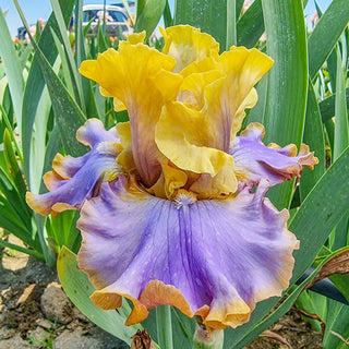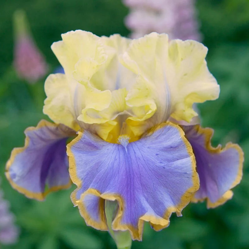 This award winning variety is equally at home in a floral arrangement or an iris bed. Its delicate looking, ruffled standards are medium yellow-green with slate-violet shading up the midribs. Soft violet blue falls have yellow edging and support yellow-orange beards. The large flowers, held high on strong stems, are an elegant addition to any late-season landscape.