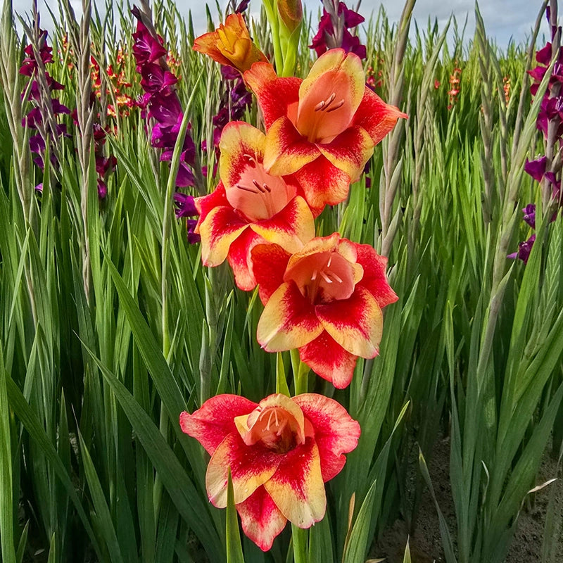 Perfectly formed flowers line sturdy, compact stems, making this showy gladiolus an easy choice for bold mass plantings. Each 3½" floret blends glowing yellow with deep rose-red for a striking sunlit effect that holds its colour well. The 30–36" flower stalks add structure along walkways, beneath mailboxes and near porches. Strong stems also make it an excellent cut flower.