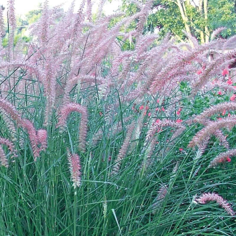 Ribbon-like blades pour from the center of a bright rose-colored fountain. Its color changes with the seasons, from rose in midsummer to golden brown when the weather gets cooler.