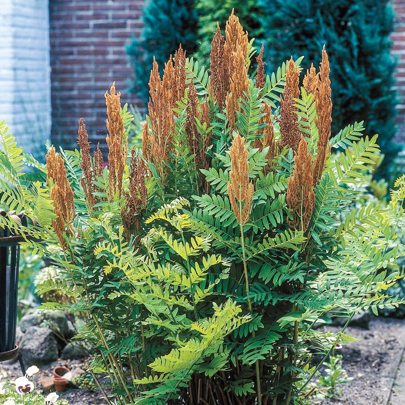 Dark red to rusty brown plumes rise above deep forest green fronds, adding texture and movement wherever shade meets moisture. Royal Fern can reach an amazing 7' tall, thriving in humus-rich, consistently moist soil. It is especially effective near ponds or streams, or when layered into woodland borders. It brings a naturalized look without ever producing flowers. Royal Fern is an attractive, reliable, long lived choice for shaded gardens.