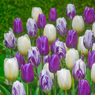 These regal tulips are purple, white and a combination of the two colours. All three yield bold, 4" blooms in the classic shape that are held aloft by sturdy stems. Varieties are not individually labeled.