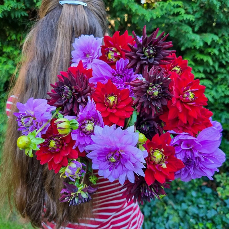 Each flower in this mix is perfectly round, showcasing the intensity of its colour. Expect a range of stunning hues, including fiery red, deep purple-red and lavender-blue. These dahlias are substantial, with a 4" diameter, and create beautiful bouquets. They are held upright by strong stems throughout the growing season, until the first frost arrives in the fall. Like most dahlias, these are unappetizing to deer, making them a reliable and low-maintenance option for any garden. Varieties are not individually labeled.