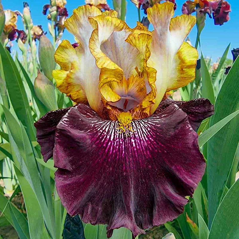 It’s ruffled cream standards, edged in golden brown and traced with fine veining, rise above bold burgundyplum falls touched with violet at the heart. More than just eye-catching, this resilient iris holds steady in rough weather thanks to its strong, storm-ready stems. The recipient of two major iris awards, Rum and Coke is a spirited choice for springtime borders or floral displays.