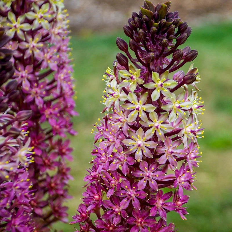Upright flower spikes topped with a pineapple like tuft carry densely packed cream florets that mature to deep rosy purple, creating a striking, tropical effect. Broad, strap shaped leaves emerge deep olive green in early summer, lightening as bloom scapes rise. Ideal for borders and especially containers.