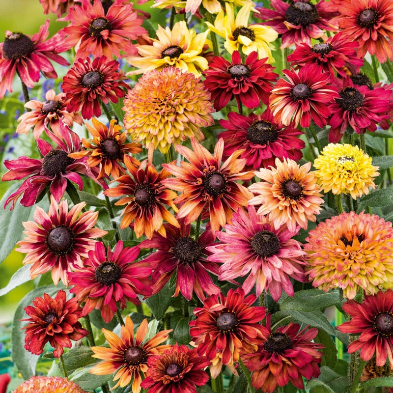 Flowers unfold in a warm blend of chocolate, caramel, ochre-yellow and golden brown. Sahara Rudbeckia flowers freely from midsummer to frost, drawing bees, butterflies and hummingbirds with its plentiful nectar. The 4–6" double daisies stand on sturdy stems up to 24" tall and tolerate dry conditions well. Perfect for naturalistic plantings, pollinator gardens or cutting for rustic late-summer arrangements. A short lived perennial most often grown as an annual.