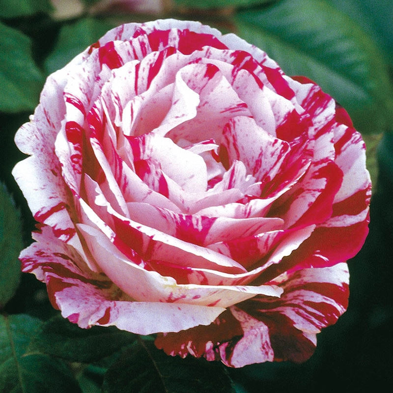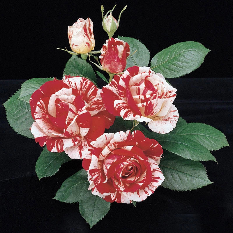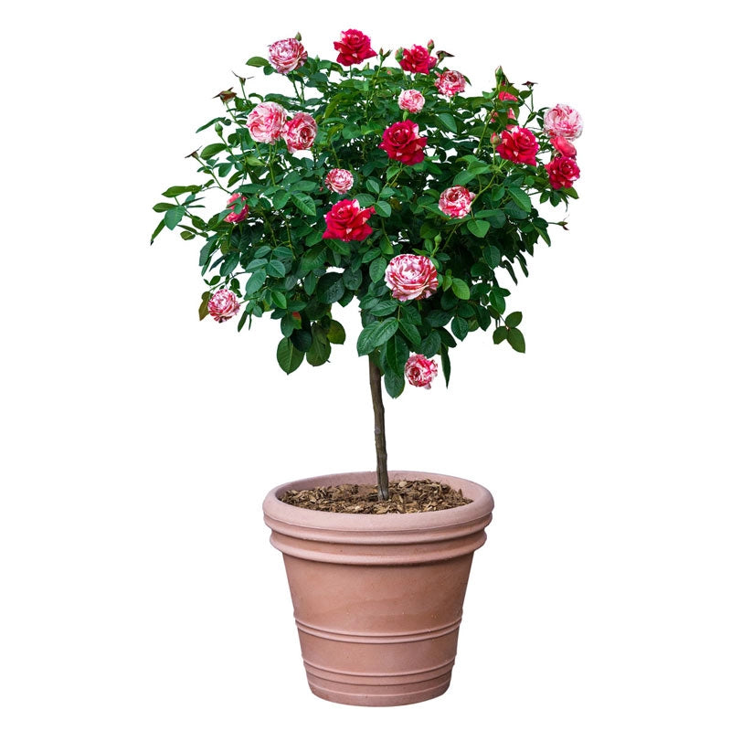 Burgundy-splashed white? Cream-swirled red? Describing the blooms of this wonder is a challenge because no two are the same. Its dazzling colouring, sweetly spicy scent and tolerance for disease, heat, humidity and pollution make it unique. The flower's ability to thrive in a metropolitan environment makes it a popular choice among urban gardeners. Scentimental's stunning appearance—its branches of colourful rose clusters bloom from well-formed buds atop a trunk as tall as 4'—and intoxicating fragrance make it ideal for both bouquets and potpourri. The clean, quilted, green foliage maintains its good looks throughout each season, year after year. Moderate temperatures will yield the largest, most colourful blooms.