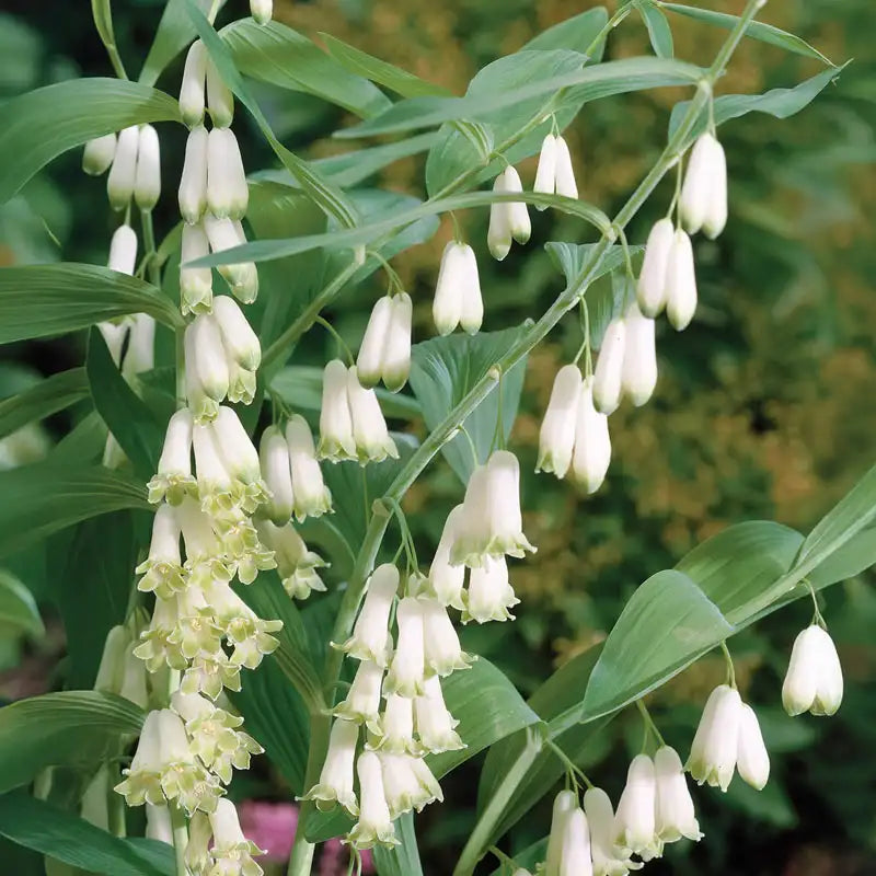An ideal growing companion for ferns, hostas and other shade-loving plants, Solomon’s Seal adds a special touch to woodland gardens. Its white, bell-shaped, 1" pendant flowers dangle from two rows on arched, unbranched stems that grow in a mounded habit. Green leaves measuring up to 4" long turn an attractive yellow in autumn. This long-lived, carefree and fragrant flower perennializes well and has been in cultivation for centuries.