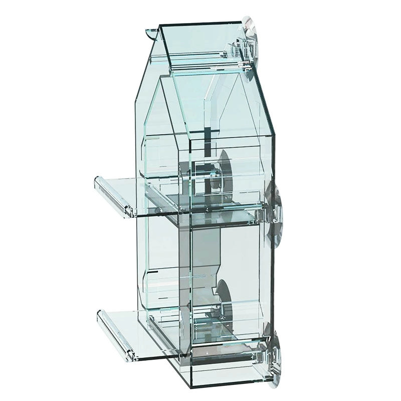 An ingenious design feature of this feeder allows you to closely watch feeding birds without startling them! Use its extra-strong suction cups to securely attach this double-decked feeder to a screenless window. Not only will its durable, crystal-clear, polycarbonate construction provide you with unobstructed views of the festivities, but its one-way mirror prevents birds from peering out while you get a closer look inside. The easily accessed refill port means you won't have any trouble quickly replenishing the feeder with up to 1 lb of mixed seed. A stay-dry seed-storage system and retractable feeding trays with drain holes help to preserve and protect seed. (12½"h, 8"w, 3¼"d)