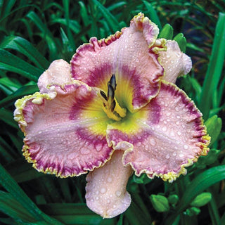 Setting a garden aglow is what this rebloomer does best. Luminous, soft pink blooms wink cheekily with violet eyes amid matching ruffled edges tipped in gleaming yellow. Enjoy the large, 5½" daylilies in borders or presentation beds. Vigorous, reliable plants are drought tolerant and prolific. Hemerocallis