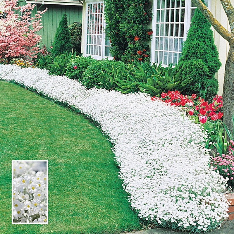 Rambling over hills and along walkways or borders, Snow in Summer lays down a thick blanket of tiny, white blooms in its path. One of the most popular flowering ground covers on the market, this gorgeous perennial blooms best in full sun and dry soil. The snowlike appearance of this carefree cultivar increases when it cascades over a wall or into a landscaped lawn.Cerastium tomentosum