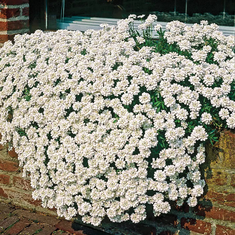 Long-lasting clusters of small, pristine white blooms reliably blanket this candytuft each spring, creating a stunning snowdrift effect in gardens. The Snowflake Evergreen Candytuft grows 8-10" tall and features glossy, deep green foliage that maintains its colour year-round in most regions, transitioning to semi-evergreen only in areas with harsh winters. This drought-tolerant, sun-loving perennial requires minimal maintenance beyond a light pruning after flowering. Ideal for cascading over retaining walls, softening pathway edges or anchoring rock gardens, it thrives in well-drained soil and full sun. Plant in groups along slopes, pair with spring bulbs or use as a flowering border in Mediterranean-style gardens. Avoid wet, heavy clay soils that could compromise winter survival.