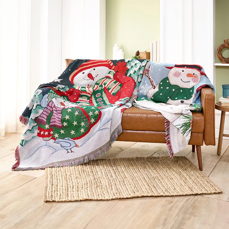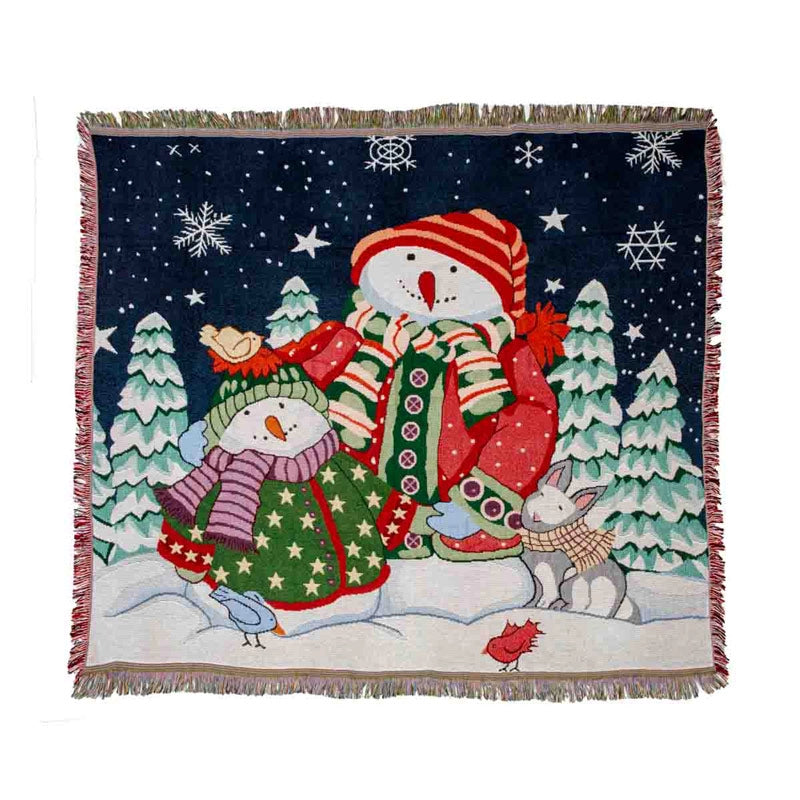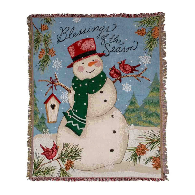 Wrap yourself in the wonder of the holidays with our festive Snowman Blankets, each brimming with handcrafted charm. Made of a durable yet soft poly/cotton blend, these throws wash beautifully and stay cozy for years of snuggling. The Snowman Blanket features a solo snowman hosting a pair of vibrant red cardinals on his arm, alongside the heartfelt "Blessings of the Season" message. The Snowman Family Blanket captures a mother and child beneath a winter night sky, their joy as timeless as the season itself. Playful fringe trims each brilliantly hued scene. Perfect for gifting—from a favorite college student to a beloved aunt—these blankets bring the warmth of home and the magic of the season wherever they're shared. (62"h, 48"w)