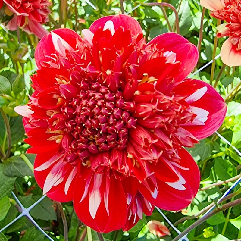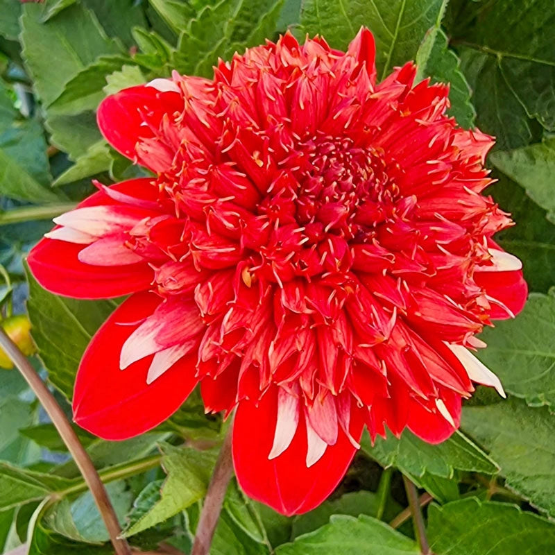 A hefty swath of this bold anemone type creates a fiery midsummer display that won't soon be forgotten. Speech features fiery red petals accented by spiky white petals, all of which surround the large, fluffy, red centre. It makes quite a scene in borders, cutting beds or feature gardens. Pollinators flock to powder puff dahlias to find a source of nourishment, and find it within the petals of this show-stopping bloom.