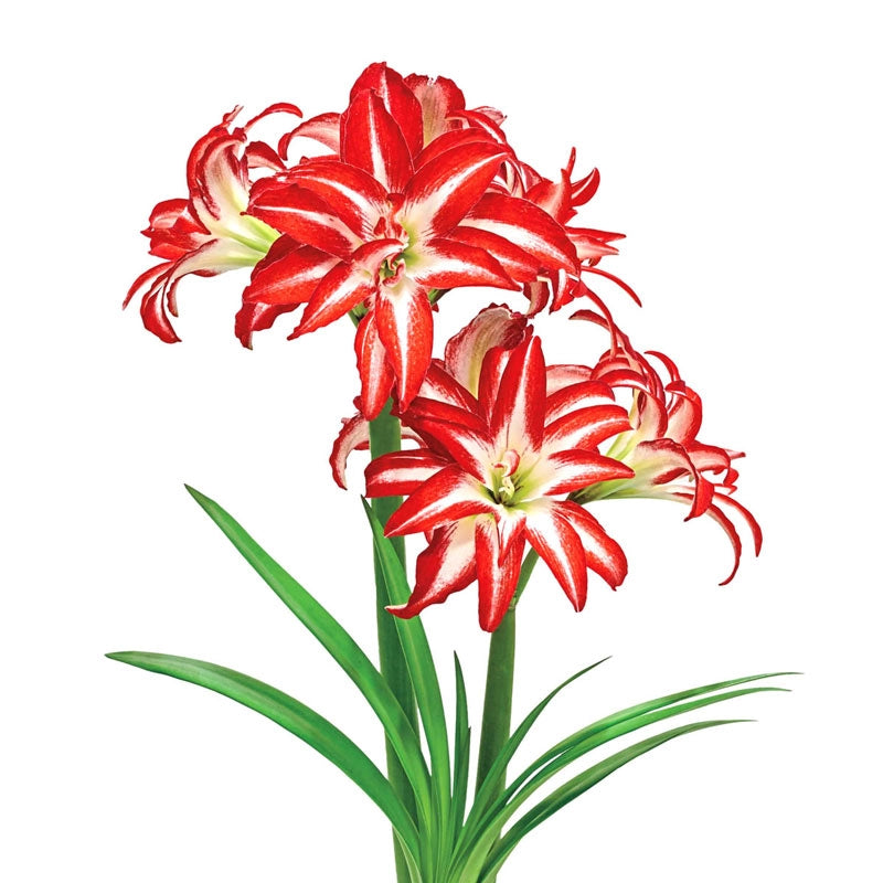 The oversized red double flowers of this amaryllis gracefully curve like the cascades of a fountain. Splash's luminous palette, which also features wide white bands and a verdant centre, harmonizes seamlessly with festive, holiday season decorations. The extra-large flowers grow to about 8½" in diameter and open on 16" stems. Gift this living treasure during the dreary winter months, and the lucky recipient will be greeted with radiant, tropical-inspired blooms about 6–8 weeks post-planting. Ships as a 26–28 cm bulb.