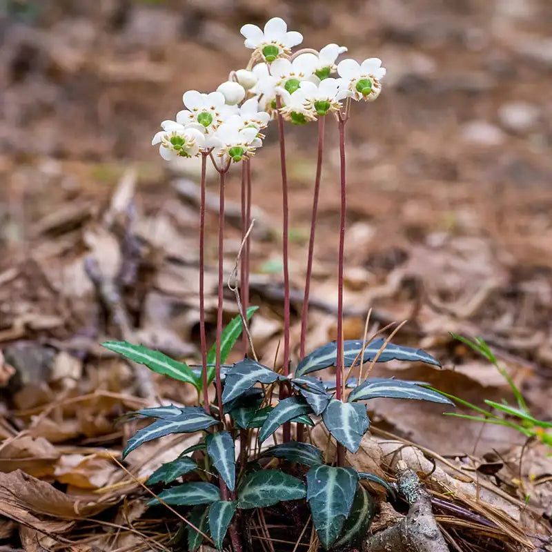 Spotted Wintergreen offers year round interest with its distinctive lance-shaped leaves featuring eye catching white marbling against deep green. In summer, delicate clusters of nodding white or pinkish flowers emerge on slender stems, releasing a sweet fragrance that attracts butterflies and pollinators. Perfect for naturalizing in woodland gardens, shaded borders or alongside meandering paths. This perennial maintains its striking variegated pattern through winter, creating visual interest even in the coldest months.