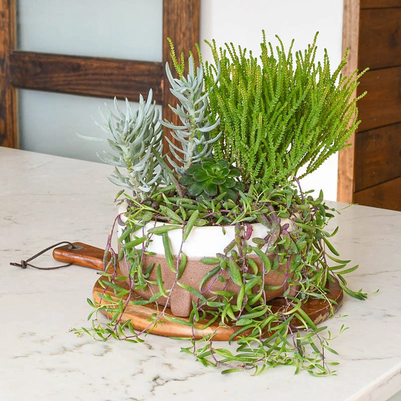 Our newest indoor garden is one for the books! Our plant experts chose four distinct succulent varieties to add lively color and texture to your home. All four plants arrive preplanted in a lovely ceramic dish that gives definite boho vibes, yet fits easily into any décor or color scheme. You get one each of Echeveria Painted, a native plant to central Mexico with long, green leaves and purple-red edging and veining; Senecio serpens "Mini Blue" with small, blue-green fingerlike leaves on a semi-trailing form; bushy Crassula muscosa "Watch Chain" that displays tiny, green leaves on compact stems; and trailing Othonna cepensis "Ruby Necklace" with green, bean-shaped leaves that turn ruby red when the plant is stressed. Makes a great Mother's Day or birthday gift! EXCLUSIVE. (4"h, 8¼" dia.)