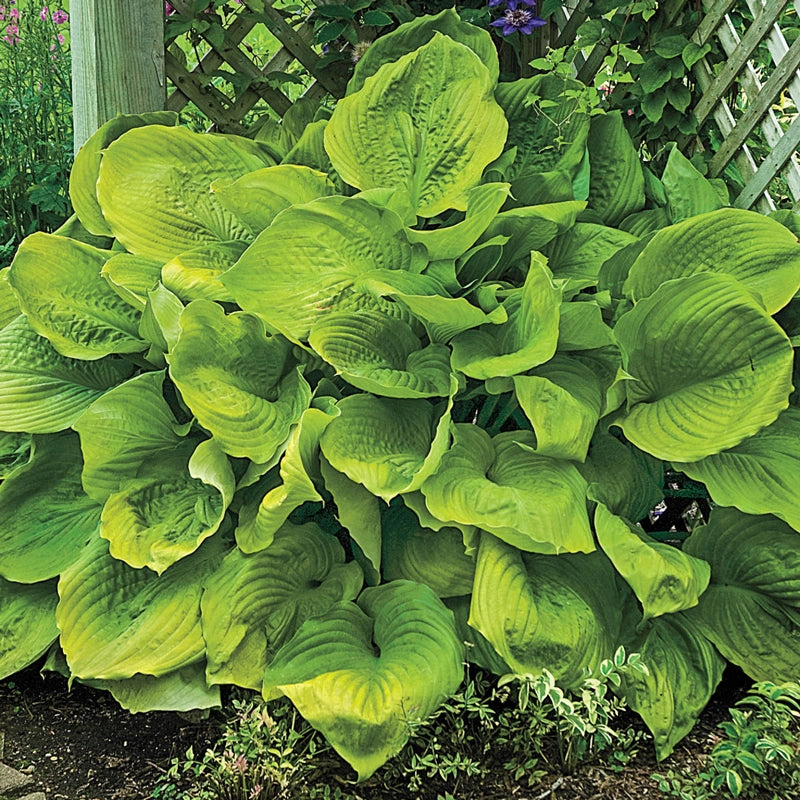 Extra tall and extra wide, this is one of the largest hostas available. It easily fills shady spaces with lush, light green foliage and delicate lilac blooms throughout the season. Soft yellow highlights add dimension to the broad leaves. Look closely and you’ll also observe the nearblack “noses” that emerge from the soil in spring.