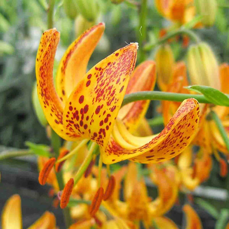 Masses of downward-facing, orange-yellow flowers with maroon speckles provide an ever-changing colour show as they nod in the morning sun. You'll delight in how easily this lily naturalizes: A mature and settled bulb produces up to 50 flowers per stem!