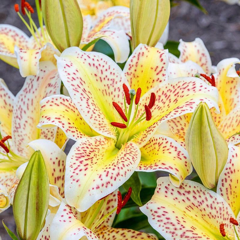 Giant, 9" blooms brighten any landscape or vase. White flowers have warm yellow centres and maroon speckles. Great perennializer. Originally called Yellow Tiger; renamed Tigermoon in 2017.