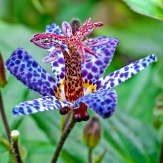 • Blue Wonder: The best blue toad lily we’ve found! This charmer brings unexpected late-season colour to shady gardens, producing clusters of spotted azure blooms. Blue Wonder’s star-shaped flowers feature unique speckled petals in deep blue with white-and-yellow centres. Perfect for naturalizing along woodland paths, tucked between hostas or stationed near shaded patios where its intricate blooms can be admired up close. What’s more, this is one shade plant that can handle some sun!