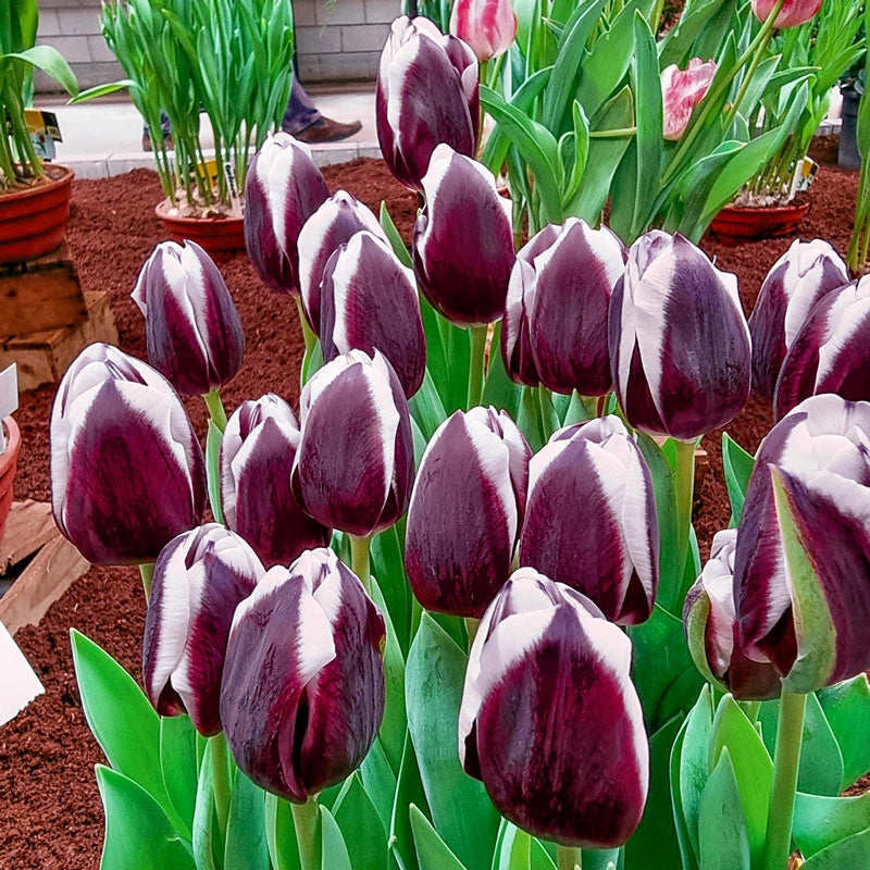 Gardeners and landscapers alike welcome the rich color and amazing appeal these gorgeous triumph tulips bring to borders, beds and gardens. Large blooms in a striking shade of purple-red are accented by wide, icy white margins that lend a wonderful contrasting effect to the scene. They easily become the centerpiece of any outdoor display or indoor arrangement.