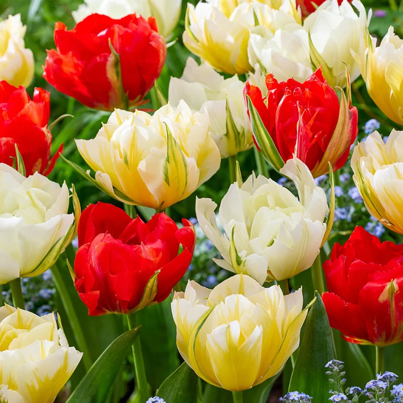 Bold and beautiful, these semi-double tulips stand up against spring’s unpredictable weather, with long-lasting blooms that don’t fade fast. Their striking green-streaked petals open to reveal vibrant yellow, fiery red and crisp white hues, adding elegance to borders and beds. Varieties are not individually labeled.