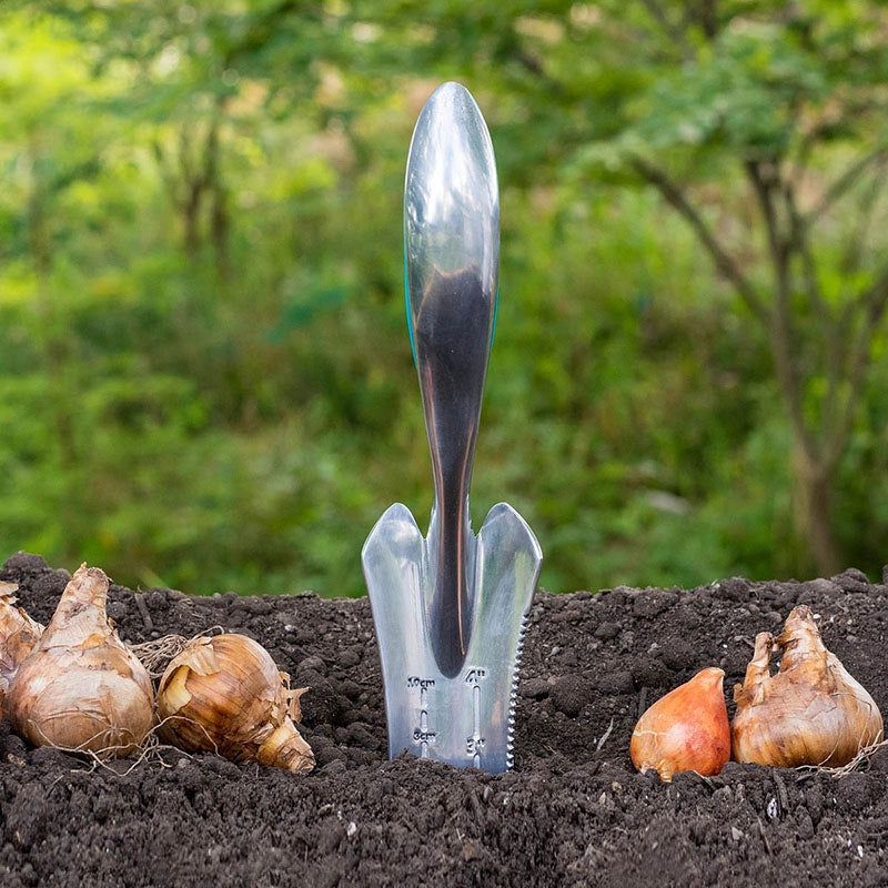 Measure, cut and dig with one tool. This trusty metal trowel has everything a bulb gardener needs, including handy planting depth marks in inches and centimetres. Serrated edge on one side cuts through pesky roots in the soil. Handle has a comfortable rubberized underside.