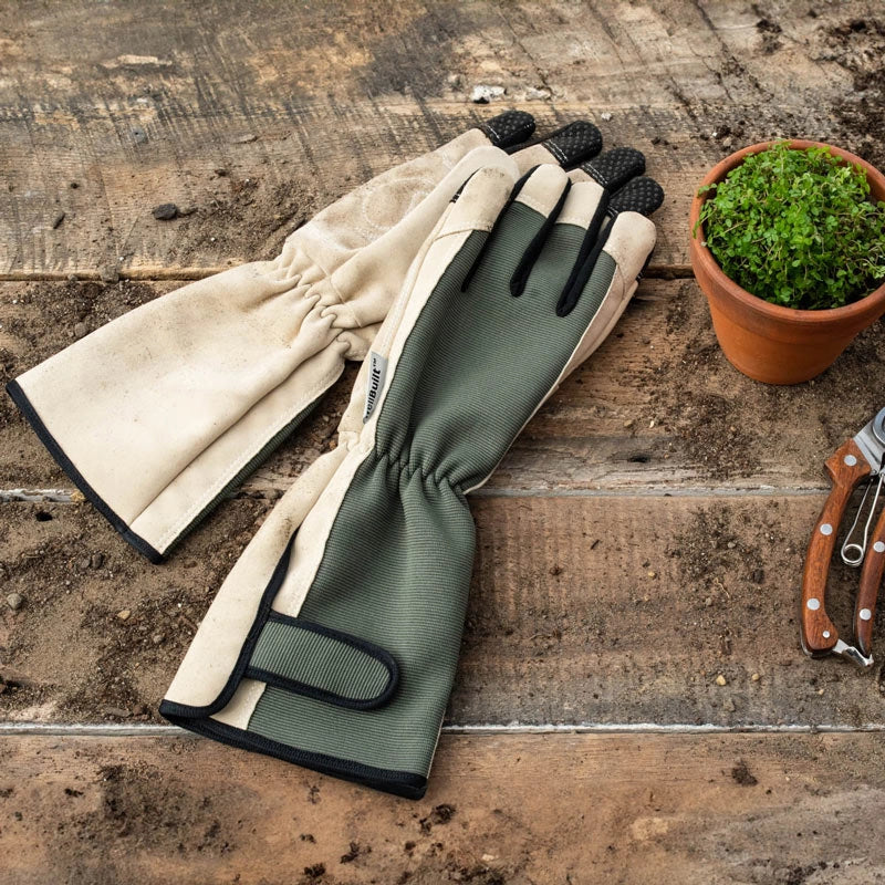 Comfy, medium-weight garden gloves feature soft-but-strong vegan leather on the grip side that resembles suede. High-end extras include reinforced stitching on the palms and adjustable hook-and-loop fasteners at the cuffs. Available in two sizes.