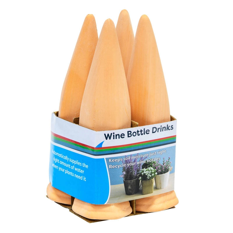 What a great way to reuse, repurpose and recycle! These innovative waterers use old wine bottles to keep your indoor or outdoor plants happily hydrated while you're away. Each terra cotta cone is designed to deliver the right amount of water based on soil moisture. As the soil dries out, it wicks water from the cone. Easy to use—simply attach the cone to the top of a clean, water-filled wine bottle and insert it cone-side down into the soil. Great for when you are taking a long weekend getaway or short trips. Set of four terra cotta cones. Wine bottles not included. 6 7/8"Hx2"Wx1 7/8"D