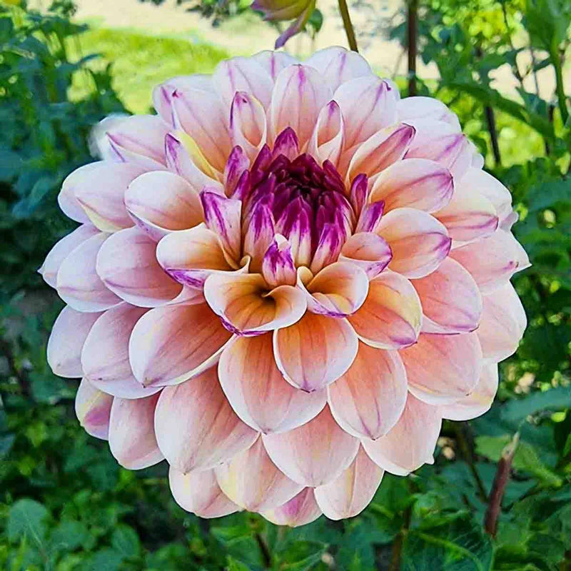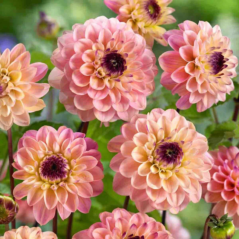 Soft peach-pink petals surround a rich, wine-coloured centre in this eye-catching ball dahlia, offering elegant contrast and vintage charm. With perfectly shaped 3" blooms, it adds structure and subtle drama to borders and bouquets alike. This variety delivers both style and substance in a compact, beautifully balanced flower.